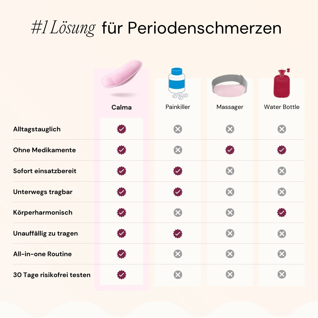 Genau hier setzt Calma an. Mit sanfter, gleichmäßiger Wärme unterstützt du deinen Körper bereits vor der Periode. Spannungen können sich lösen, die Durchblutung wird unterstützt – bevor sich Beschwerden verstärken. So bleibst du im Gleichgewicht, statt erst zu reagieren, wenn der Schmerz schon da ist.