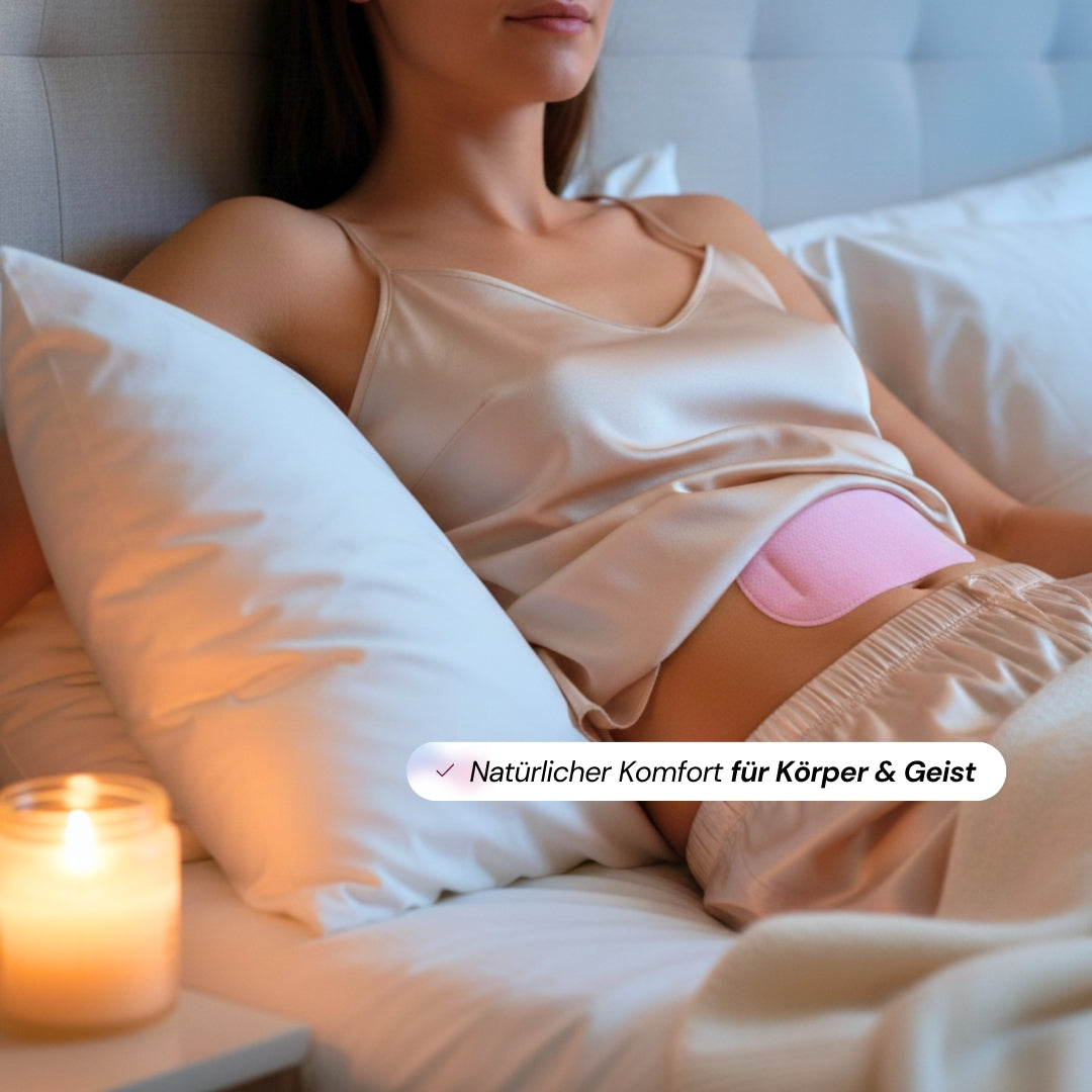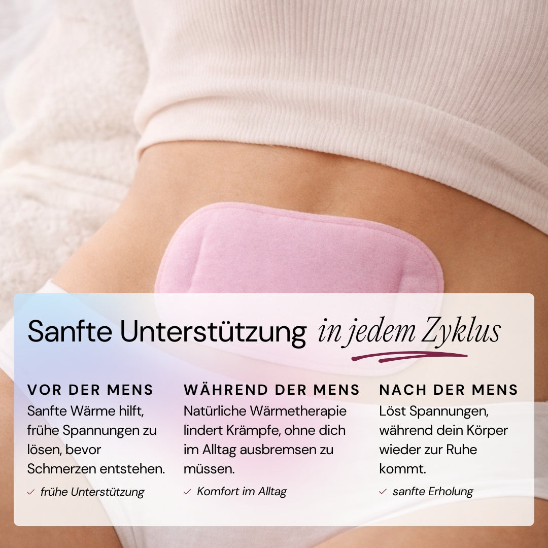 Die sanfte Wärme von Calma unterstützt den Körper dabei, angesammelte Spannungen loszulassen und wieder in einen entspannten Zustand zu finden. Durch die Förderung von Durchblutung und Muskelentspannung entsteht ein beruhigender Effekt, auf den der Körper spürbar reagiert – für mehr Ausgeglichenheit und ein ruhigeres Gefühl vor und während deines Zyklus.
