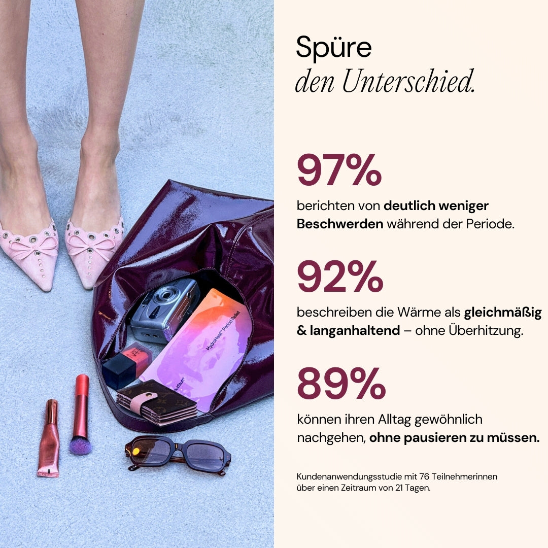 Schon bei der ersten Anwendung unterstützt Calma deinen Körper auf natürliche Weise. Gleichmäßige, sanfte Wärme hilft dabei, Verspannungen zu lösen und die Durchblutung zu fördern. Statt deinen Tag um Krämpfe herum zu planen, arbeitet Calma still mit deinem Körper – damit du in deinem eigenen Tempo weitermachen kannst.
