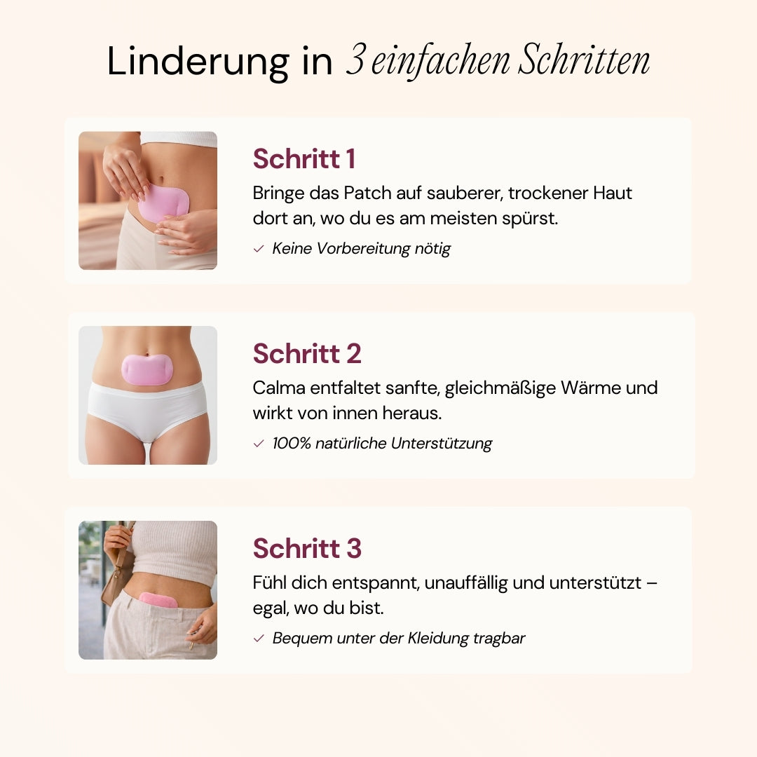 Calma gibt gleichmäßige, beruhigende Wärme ab, die Krämpfe lindert, während du deinem Alltag nachgehst – ohne Pause, ohne Unterbrechung.