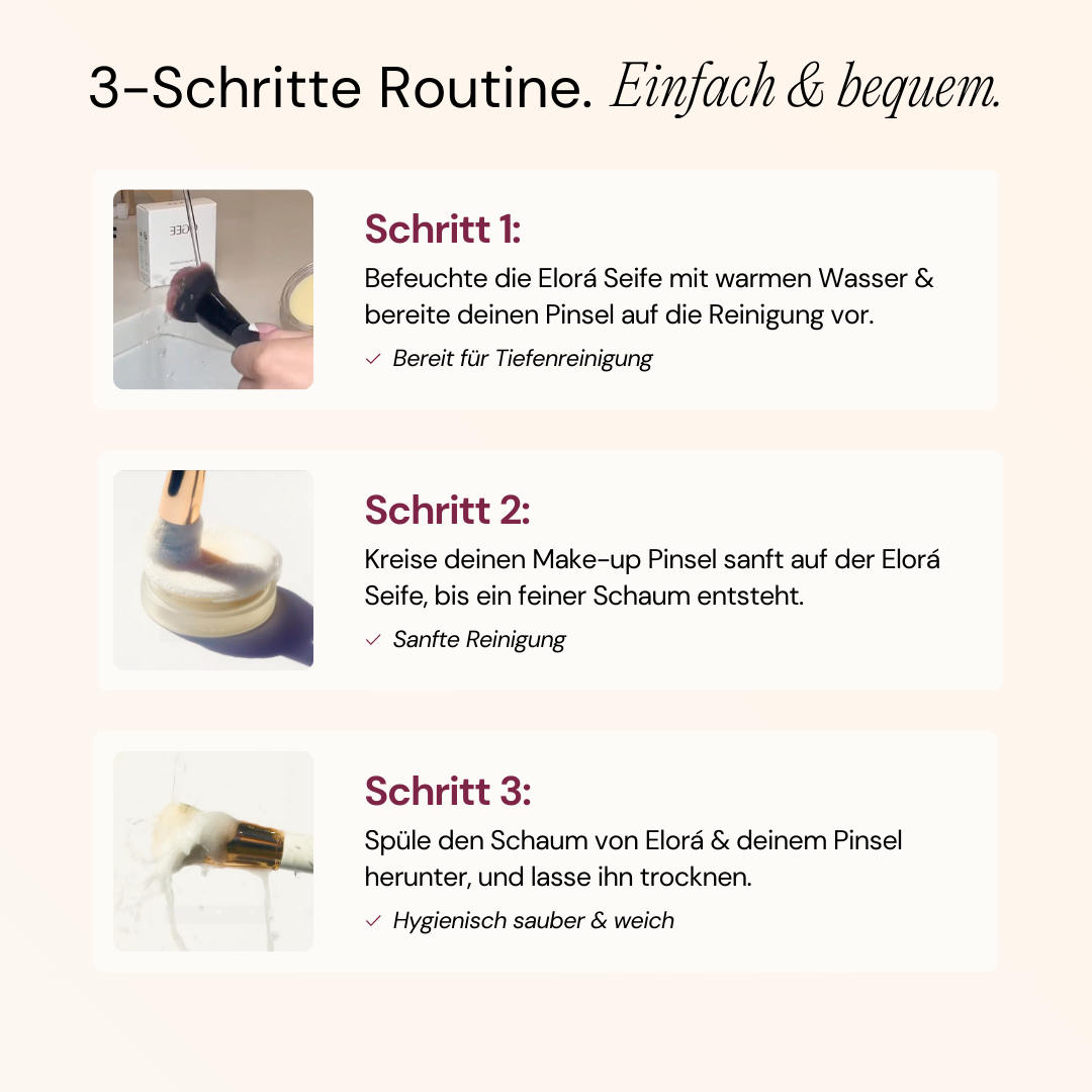 Mit Elorá reinigst du deine Pinsel in Sekunden und löst selbst hartnäckige Rückstände problemlos – ohne einen Ölfilm zu hinterlassen oder die Borsten auszutrocknen. Die sanfte, 100% pflanzliche Formel reinigt bis ins Detail und macht deine Pinsel wieder weich & hygienisch – für klare Haut und ein perfektes Make-up-Finish.